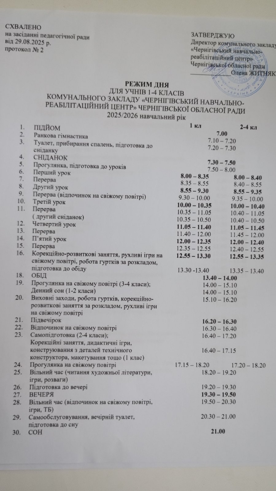 Режим дня для учнів 1-4 класів