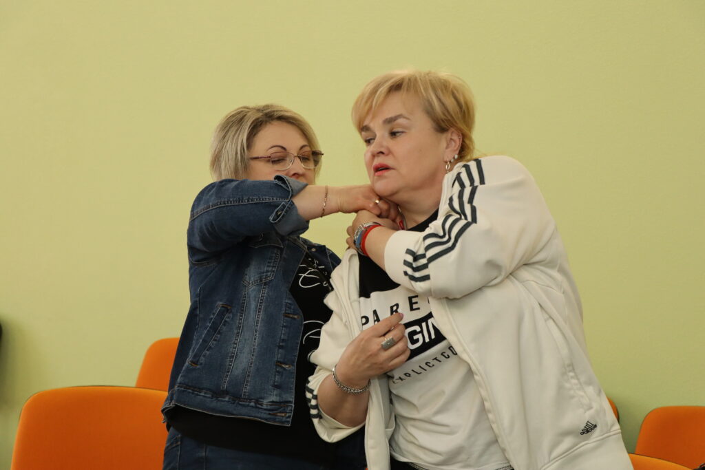 Найважливіше в цьому тренінгу — практика. Учасники/-ці відпрацьовували навички у парах, відпрацьовували серцево-легеневу реанімацію на манекені, ознайомилися з роботою дефібрилятора, спробували свої сили на тренажері-жилеті для тренування прийому Геймліха.